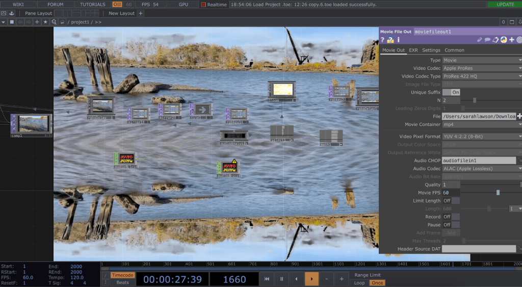 While the hydrophone was busy with its labor of recording, I was also capturing videos on my phone to document this strange liminal place: between land and water, city and industry, natural and manufactured. I used these videos as the basis for the visual components of “Bush Terminal,” the sonic-optic experiment that accompanies this section. In TouchDesigner, I created a chain of visual effects to resemble the sensation of being immersed in this aquatic industrial environment. The visuals are paired with a hybrid soundscape arranged from the hydrophone recording and MIDI notes, which encourages careful attention to the vibrant activity lurking underneath an urban pier. I wanted to create the feeling of being inside the waves, of moving with the water and sand as they shift and merge into something both unified and unique.