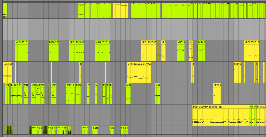 It was the late afternoon of an October day and the tide was fast approaching, but pockets of sand glistened, smooth and undisturbed, and I could access them easily by stepping down from the craggy concrete blocks. I took advantage of this short window to record underneath the sand as the water washed in. The hydrophone was able to pick up the movement of the waves with a crisp quality of precision. I recorded for about 40 minutes in total. Later, I downloaded the file to my computer and reviewed it in Ableton to pinpoint peaks of sonic activity so I could arrange a composition around those vibrational bursts. I converted segments into other instruments using MIDI (Musical Instrument Digital Interface), so the sound of a wave crashing would be produced as different kinds of oscillating patterns: keys; drum rack; pitched ambience (an atmospheric background element); samples for drum pads or synthesizers. Every audio element was translated or converted directly from the original recording.