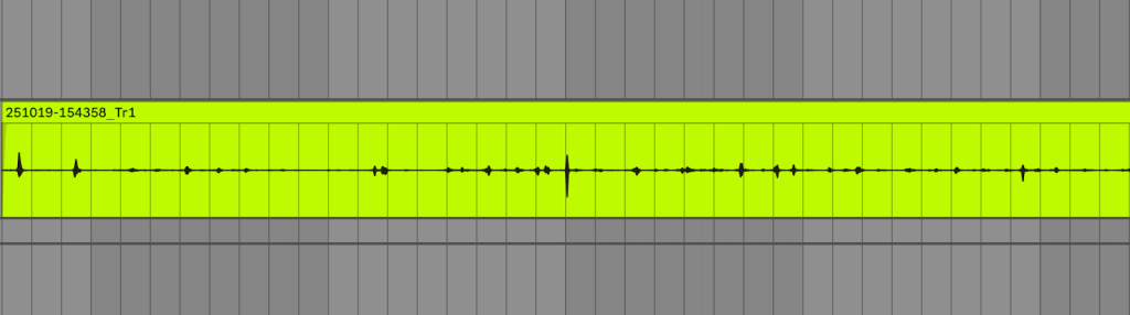 The fallen tree was not just a strategic field desk placement, but also a site where other detritus and fungal or microbial outgrowths may have gathered in response to the tree’s falling, taking advantage of this new habitat-creating event. I unfurled the hydrophone and cable from its packaging and dug into the soil next to the trunk with a trowel, then pushed the hydrophone as deep as I could into the earth with the assistance of a ground spike attached to the bottom. After I started recording, I could listen to the output by plugging a pair of over-ear headphones into the recorder. I leaned on the trunk and listened for any sign of life, holding myself as still as possible, tuning into any expression of the environment. The hydrophone picked up a slight crackling and occasional signs of faint vibrational activity, but the majority of the sound it captured during this outing was from any kind of disturbance made to the cable attaching it to the mic, which picked up even the most minute of movements. The hydrophone also detected any moments when I stepped on the ground, so I had to learn to adjust my desire for mobility to limit any contributions I might make as an unintended instrument.